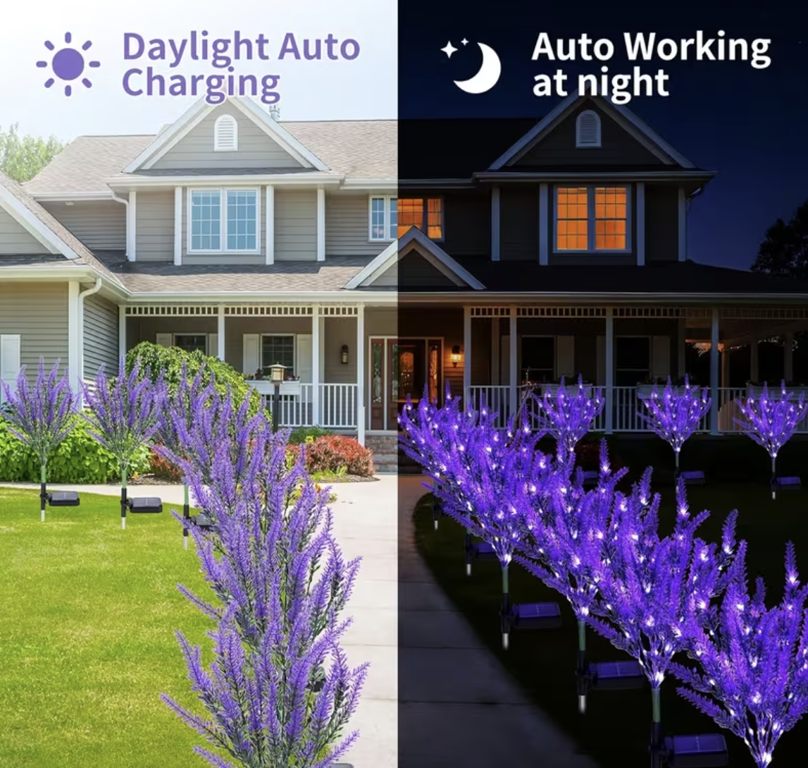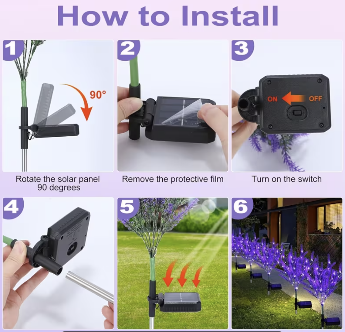 Florile decorative imita perfect aspectul lavandei, iar iluminarea LED creeaza un joc de lumini placut, ideal pentru alei, gazon, straturi de flori sau zona din jurul terasei. Nu necesita cabluri sau alimentare la priza, iar montajul se face rapid, prin fixare directa in sol.